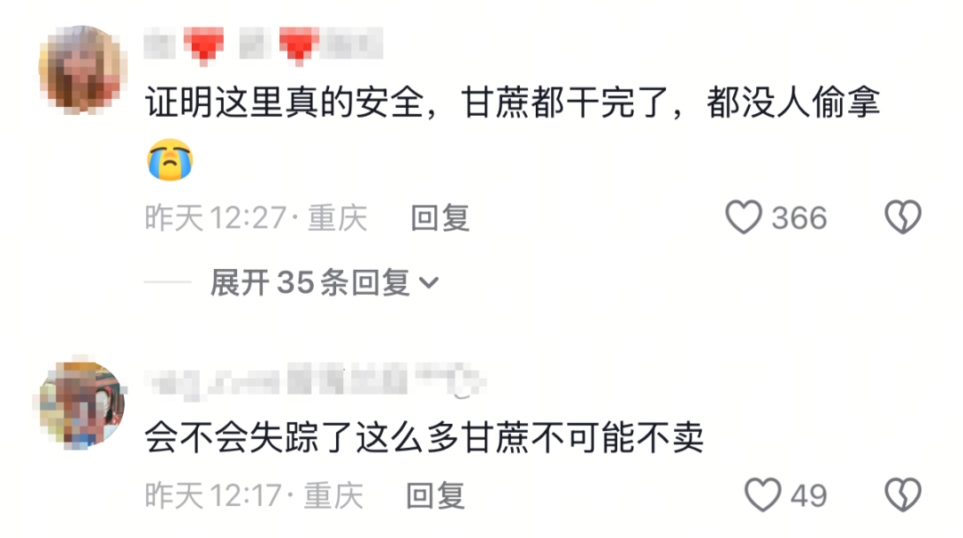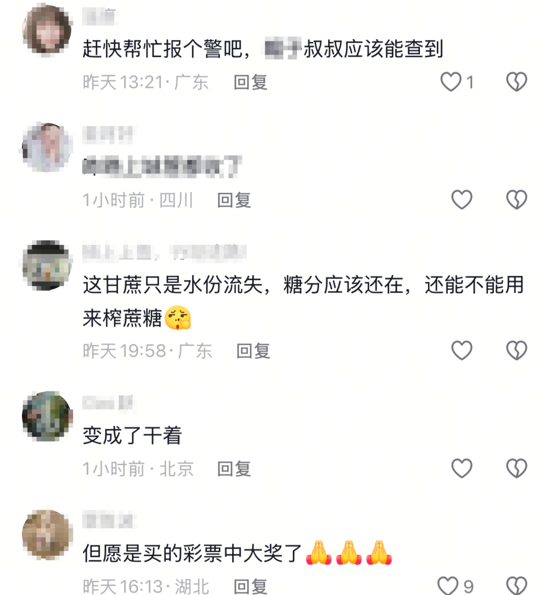 在该视频辩驳区,也有很多网友眷注卖甘蔗老迈的去处。“飞快帮衬报个警吧,叔叔应该能查到”“会不会失散了,这样多甘蔗弗成能不卖”……
