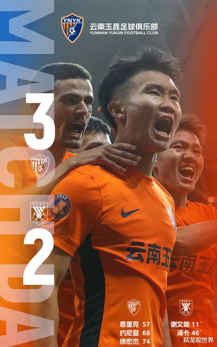 那场比赛进行到第11分钟,谢文能抢断后左脚远射贴地斩,泰山1-0!第45+1分钟,泽卡远射再下一城,泰山半场2-0当先。下半场风浪突变,第57分钟,奥斯卡助攻恩里克头球破门,1-2!第68分钟,约尼查远射破门,2-2!第74分钟,徐宏杰禁区内抽射破门,云南让二追三,3-2逆转!
