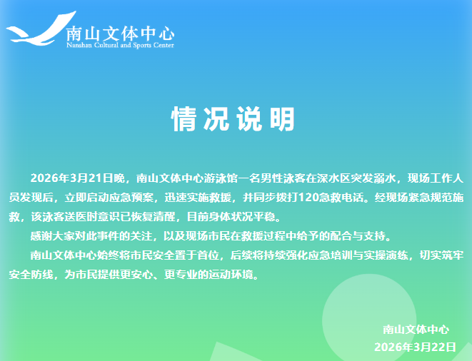 2026年3月21日晚,南山体裁中心拍浮馆别称男性泳客在深水区突发溺水,现场责任主说念主员发现后,米兰体育官网立即开动救急预案,飞快本质赈济,Z6尊龙并同步拨打120急救电话。经现场紧要轨范施救,该泳客送医时意志已还原清澈,当今肉体气象安静。