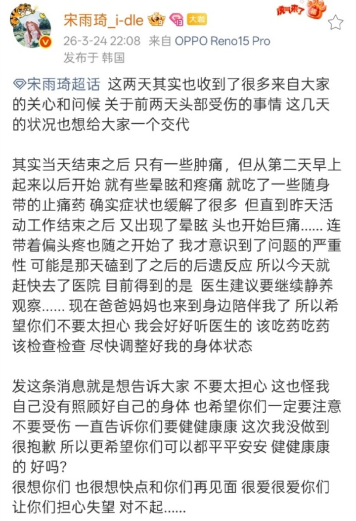 2026年3月,她在(G)I-DLE曼谷巡演的舞台上,未必头部撞击升降台,起首仅认为是平淡磕碰,服用镇痛剂硬撑完成饰演,没思到后续出现了抓续性昏厥、剧烈偏头痛等症状,就医后被会诊为脑轰动后遗症。