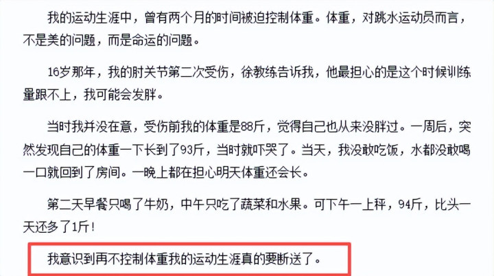 为了减肥,她饿到虚脱,落下了一辈子的肠胃过失,最终22岁就因为满身伤病被动退役,她太懂全红婵此刻的难处了。