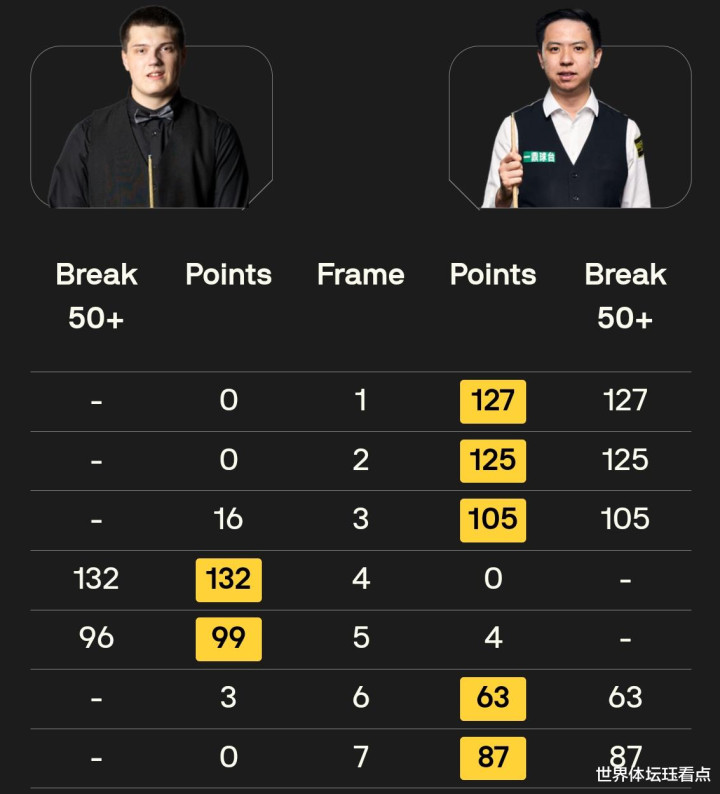 第四局,威尔逊单杆打出60分以66:17赢下此局3-1异常吕昊天。第五局,威尔逊单杆打出115分以115:8拿下此局从而4-1异常吕昊天领先拿到赛点。