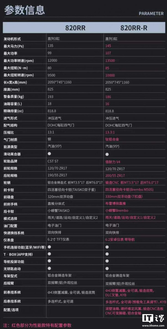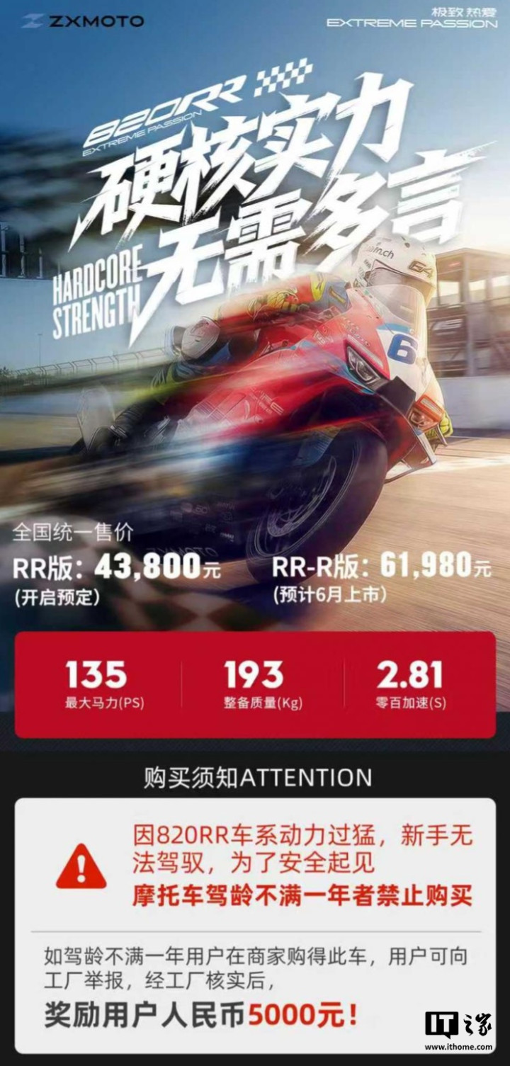 IT之家查询获悉,820RR车型售价4.38万元起,最大马力可达135PS,零百加快仅2.81秒。